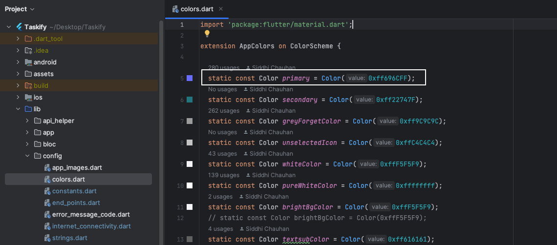 • Go to colors.dart file from helper folder. (lib->config->colors.dart)