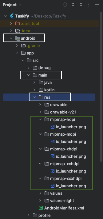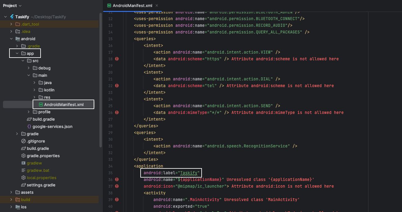 • For Android, open android > app > src > main > open AndroidManifest.xml and inside that label change that string as shown in below image