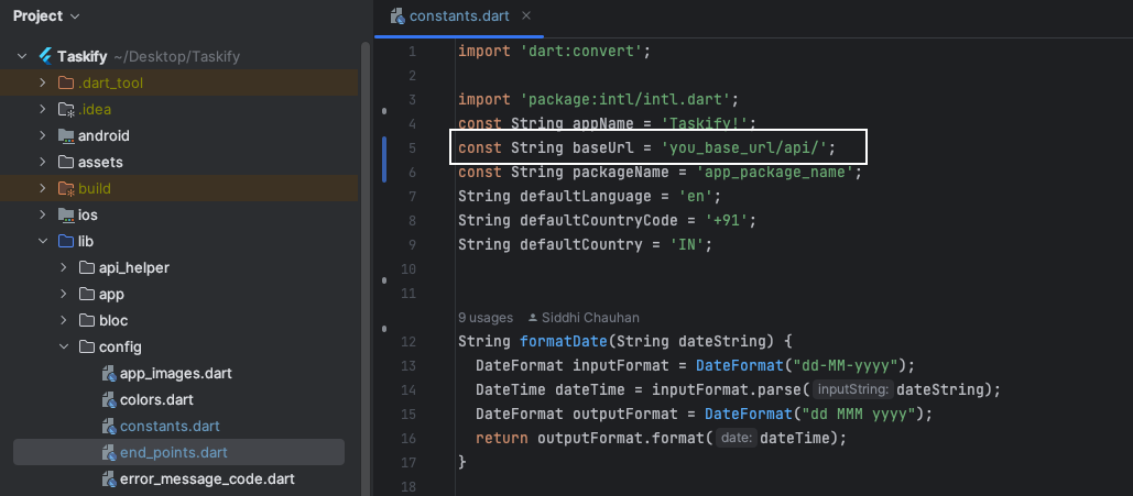 • Go to constants.dart file from helper folder. (lib->config->constant.dart)