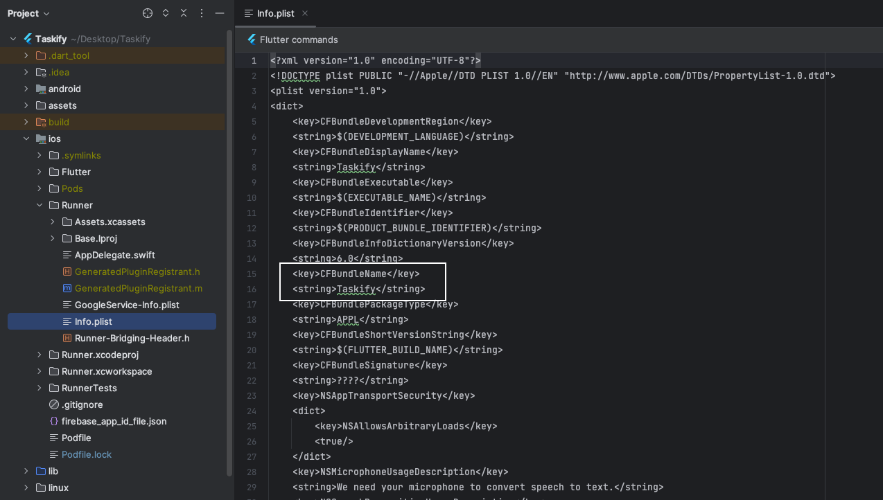 • For iOS, open ios > Runner > Info.plist inside that there is key CFBundleName, change that key's string as shown in below image